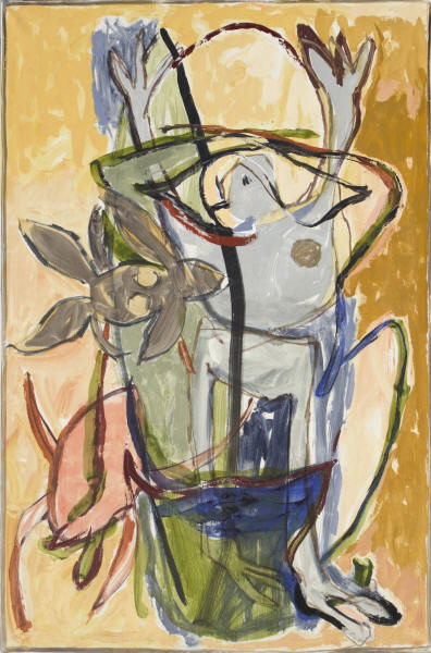 Colette Curfs, 1993, Zelfportret met schrijvertje, Oleo sobre lino, 200x130 cm, Ref. cu9305