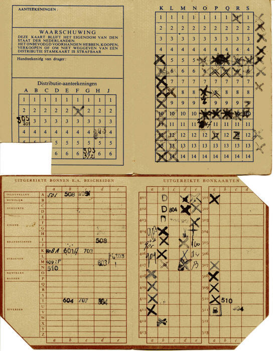 Achterkant van de distributiestamkaart met de aantekeningen van ontvangen bonkaarten.
