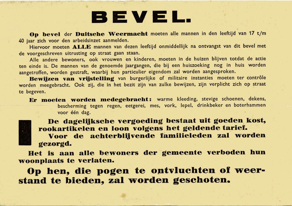 Bevel tot aanmelding voor de arbeidsinzet in Duitsland. Nu moest ook mijn vader 'onderduiken'. Wij hadden in Voorburg twee kamers en