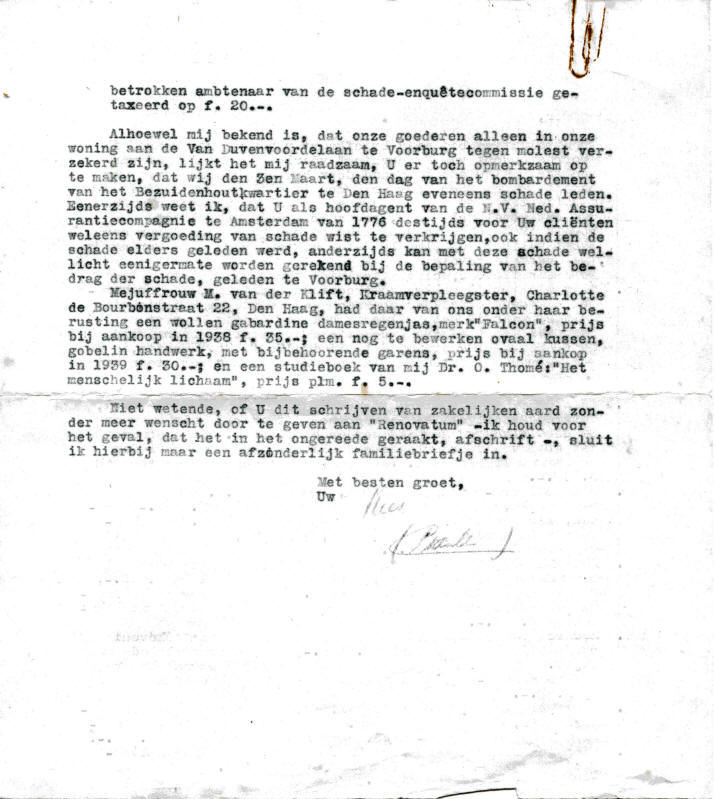 aan huisraad claimt die werd opgelopen door een bominslag op 10 meter van de woning. Het laat zien hoe belangrijk kleine zaken waren in de schaarste economie van